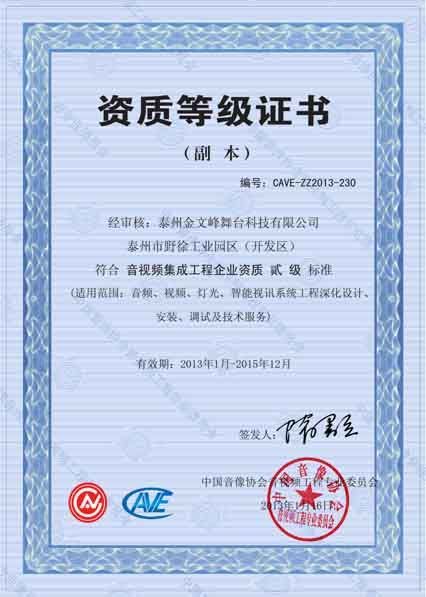喜訊:本公司榮獲中國音視頻協(xié)會音視頻集成工程企業(yè)資質(zhì)二級 發(fā)布時間:2013/4/24 7:10:42來源:點擊: 喜訊:本公司榮獲中國音視頻協(xié)會音視頻集成工程企業(yè)資質(zhì)二級