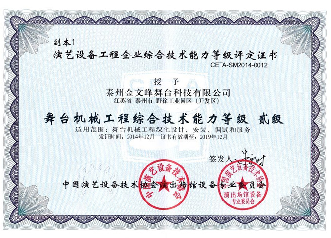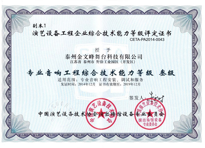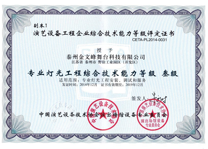 2015年元月1日本公司獲得中國演藝設備技術協(xié)會舞臺機械貳級,燈光叁級,音響叁級證書 發(fā)布時間:2015/1/27 7:30:07來源:點擊: 2015年元月1日本公司獲得中國演藝設備技術協(xié)會舞臺機械貳級,燈光叁級,音響叁級證書
