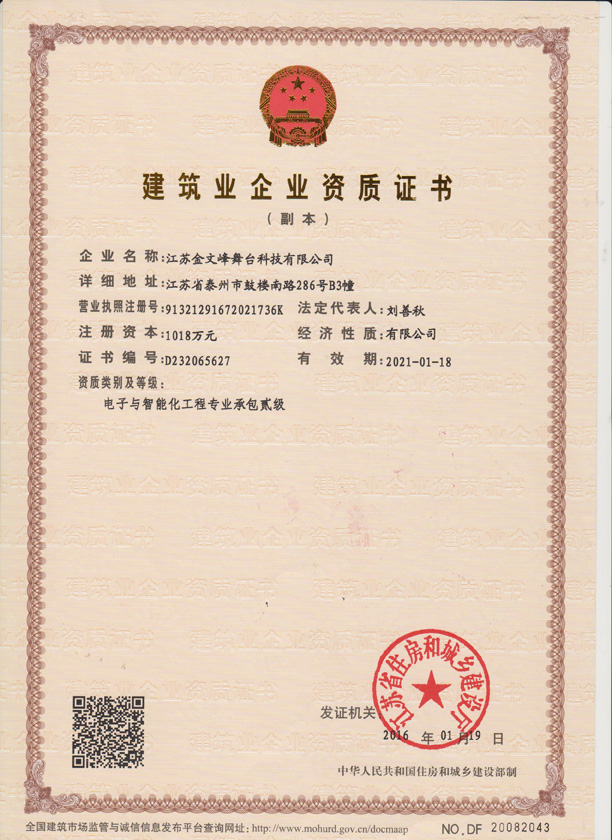 喜訊:2016年2月23日本公司建筑智能化三級(jí)榮升電子與智能化工程專業(yè)承包貳級(jí)